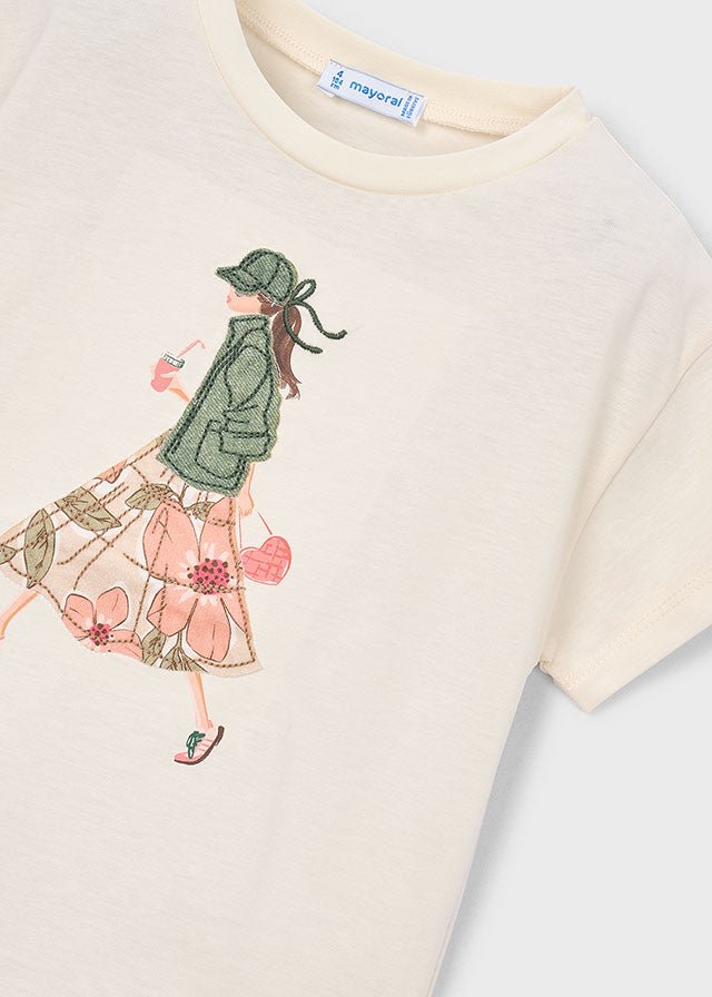 A charming girls’ short sleeve t-shirt by Mayoral, designed in a soft cream tone with a delicate illustrated girl print. A sweet everyday piece that adds a gentle, stylish touch to casual outfits while keeping comfort at the forefront.