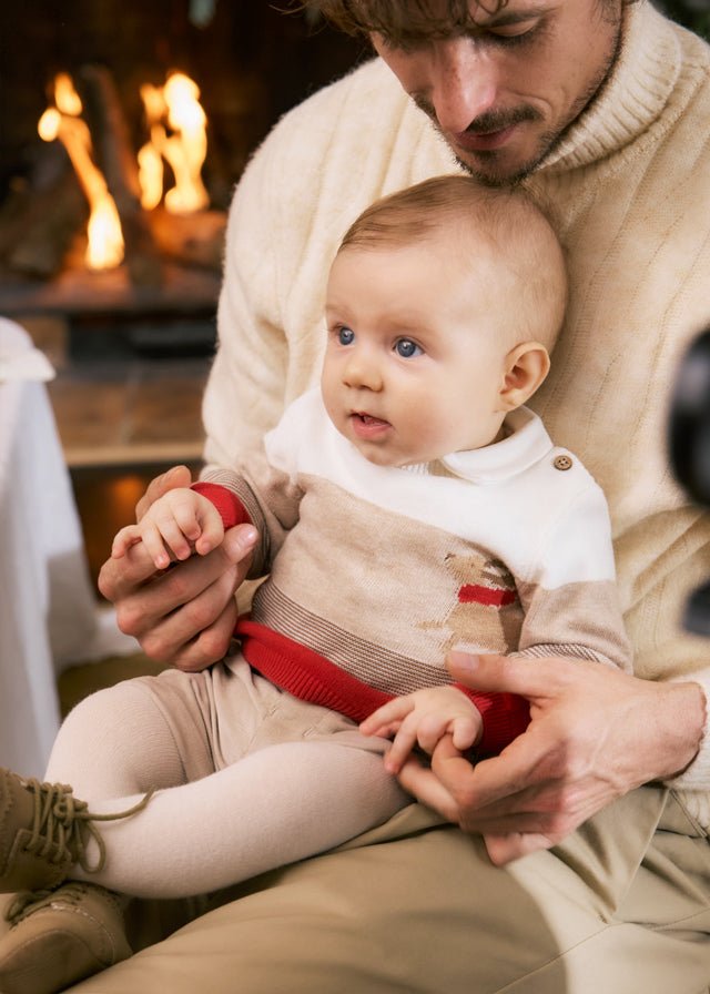 Soft and classic 3-piece set for newborn boys, featuring a cosy knitted jumper with a sweet dog motif, beige corduroy shorts, and matching ivory tights for a warm, layered look. Perfect for everyday wear or special occasions.