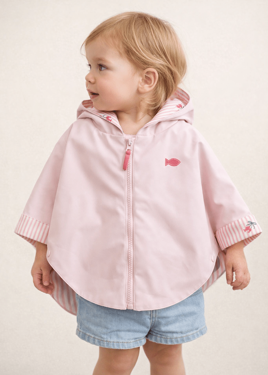 This Week-end à la Mer baby girl hooded rain cape is a practical and stylish outer layer designed for wet and windy days. Made to be waterproof and wind resistant, it features a soft cotton jersey lining with delicate pink and white Breton stripes and sweet heart motifs. Finished with charming feminine details, this rain cape is ideal for everyday wear while keeping little ones comfortable and protected.