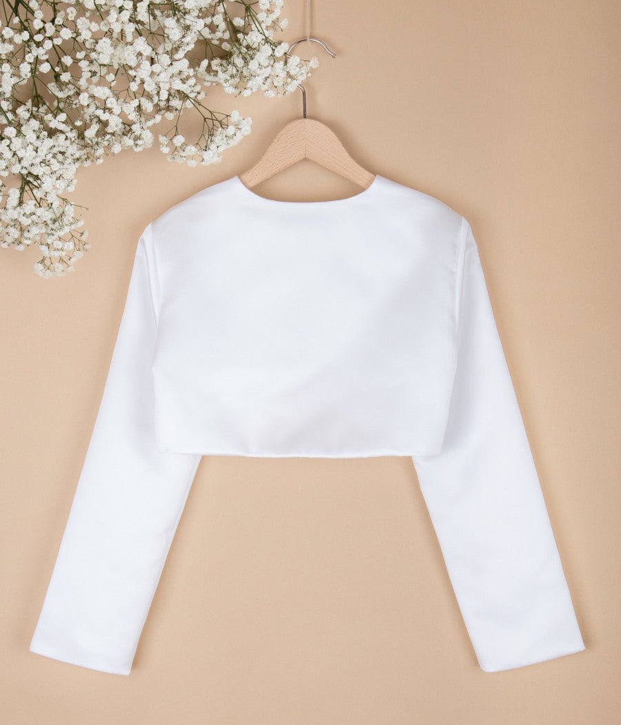 Elegant satin bolero designed especially for First Communion. Featuring a simple, classic cut with long sleeves, this bolero adds a refined finishing touch to Communion dresses while providing light coverage. Carefully crafted with attention to detail for a timeless and polished look.